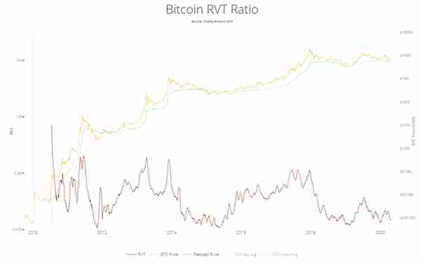 RVT 比率由David Puell最早创建, 为可实现市值(RV)和链上交易额(Transaction Volume)的 比值。 和MVRV 的不同之处是,RVT是利用可实现市值作为分子,并利用链上交易额作为分母。计算公式如下: