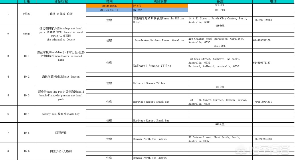 将出发的机票,酒店,整理成excel文档,包含了飞机的航班起降时间,航班号,酒店地点,电话,保单等重要信息。这份行程单我也会在出发前发送给父母亲人,便于他们知道我哪天在哪里,怎么联系上我。给保单信息,便于我到国外需要出险时,可以让**的家人协助。
