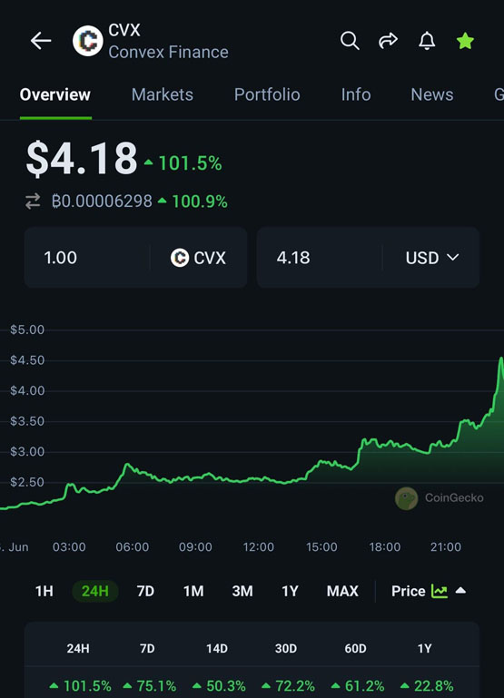 今(17)日,Curve上的收益聚合器Convex Finance**$CVX的价格飙升超过100%,吸引了市场大量的关注,不仅如此,6月16日,$CVX在Binance的CVX/USDT现货交易对的交易量达到3,200万美元,创下了历史单日新高。