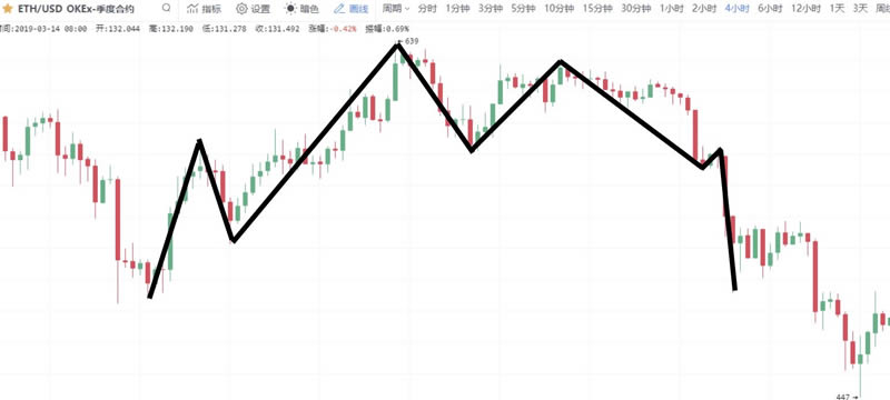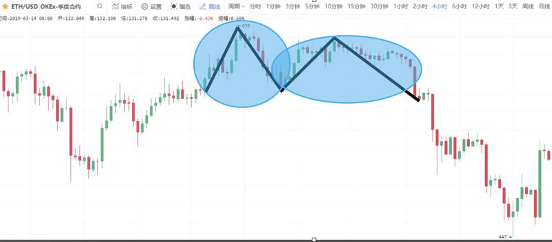 截图来自OKEx,以太坊季度合约K线图,画线处为M头结构,因其结构像一个双头怪,因此也叫双头形态。