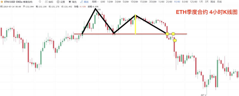 案例三截图来自OKEx以太坊季度合约4小时K线图,价格在破位M头结构颈线后,相继出现教科书般的三个卖点。