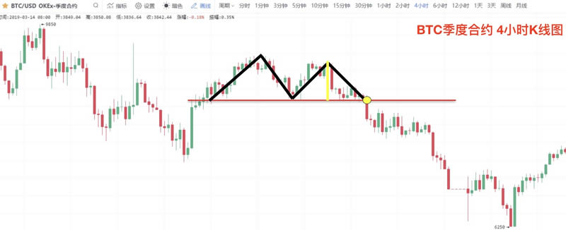 截图来自OKEx比特币季度合约4小时K线图,价格在持续上涨后,高位形成双头结构,并以中阴线完成破位,后市出现持续下跌,形成趋势的**反转。