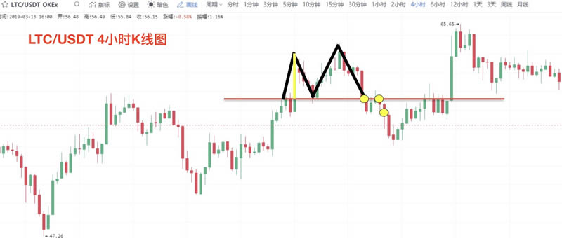 **一个案例截图来自OKEx莱特币兑USDT4小时K线图,该M头的构筑时间较短,价格破位后实效性也相应的缩短,**下跌深度刚好触碰可预测范围极限。