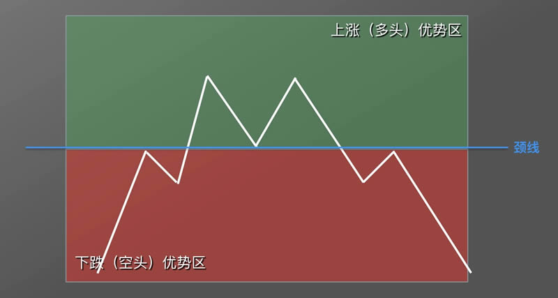 颈线之上,为上涨多头优势区,该范围内宜买涨,不宜卖空。颈线之下,为下跌空头优势区,该范围内宜卖空,不宜买涨。
