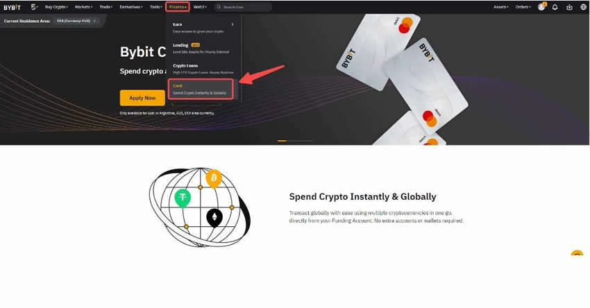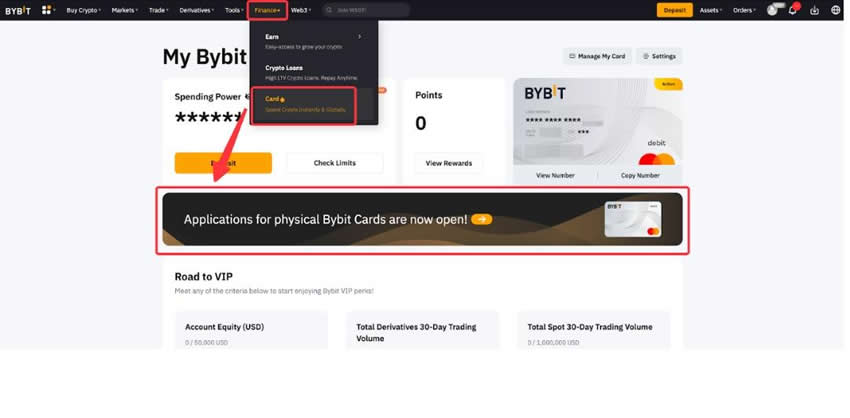 2、虚拟卡获得成功之后,打开首页,进入财务→卡。单击实体Bybit卡申请横幅。