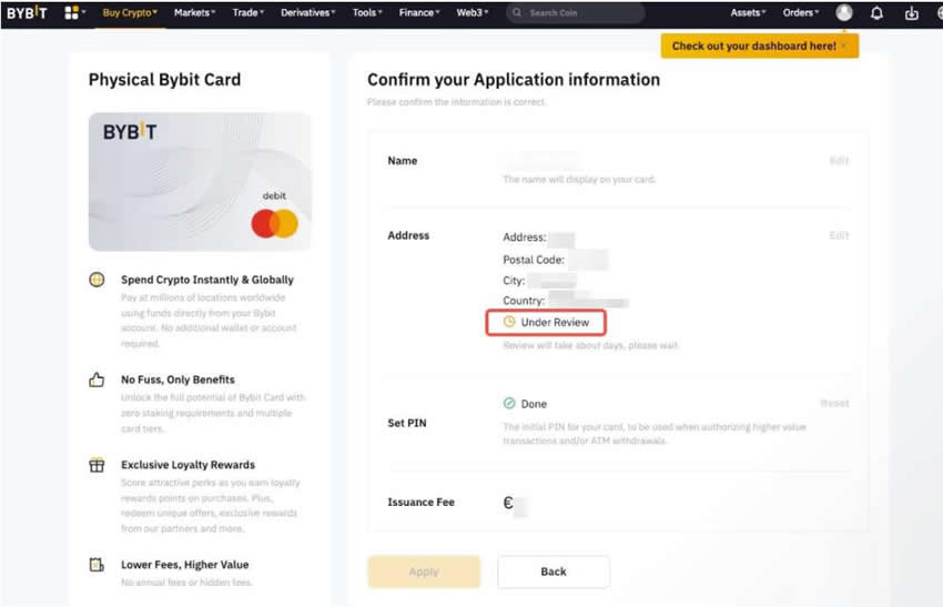 6、一旦您的地址审核获得批准,您可以返回申请页面并点击“申请”,系统将提示您支付发卡费。实体Bybit卡的发行费用将从您的资金账户中直接扣除。选择您想要的付款方式,然后点击支付。输入您的电子邮件和Google2FA代码以确认付款。