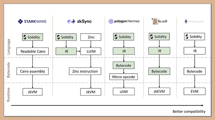 StarkNet 没有和 Hermez 和 Scroll 一样针对以太坊操作码做 ZK 电路,而是自己做了一套更加 ZK 友好的汇编语言、AIR(代数中间表示) 以及**语言 Cairo。