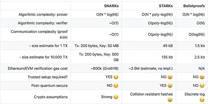 总结一下,相比 SNARK,STARK 更安全,平均验证时间和证明大小将随着验证规模扩大而**,缺点在于初始证明尺寸更大,因此更适合大规模应用。
