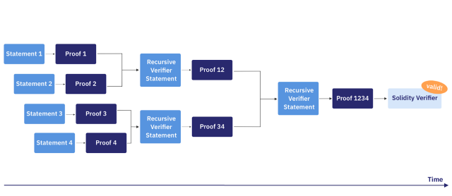 **通用的、简洁的知识系统的证明/论证(特别是STARKs) 都可以用来递增地验证计算。这意味着一个计算可以产生一个证明,以证明该计算的前一个实例的正确性,这个概念被非正式地称为 “递归证明组合"或者"递归STARKs”。