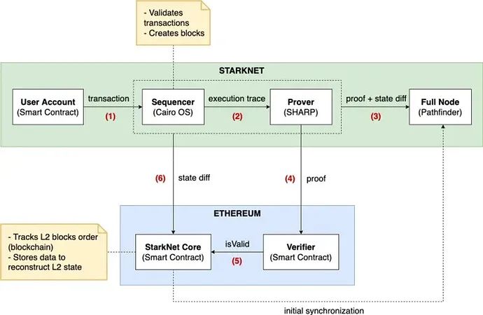 当我们在 StarkNet 上发起一个交易,一个链下服务器——排序器将会接收、排序、验证,并将它们打包到区块。执行交易,然后状态转换发送给 StarkNet Core 合约; 证明者将为交易生成证明,并发送给以太坊的验证者合约; 验证者将验证结果发送到以太坊上的 StarkNet Core 合约,并从 StarkNet Core 合约触发一组新的以太坊交易,以更新链上的全局状态以进行记录保存。状态事务作为“calldata” (EIP-4844后为Blob)来发送,以节省 L1 事务 gas。这些“metadata”可被 StarkNet 全节点解密。全节点基本发挥存储功能。全节点存储状态改变、元数据、证明以及记录在 StarkNet 中的已被执行的所有事务,并跟踪系统的当前全局状态。在有必要的时候,全节点将解密“metadata”来重构 StarkNet 的历史。