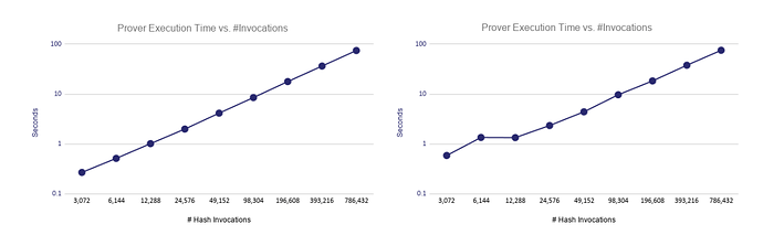 在 80 比特的安全级,STARK 每 12288 次哈希调用的证明者执行时间为 1 秒,得 12288次/S;而每 98304 次哈希调用需要 10 秒,得 9830次/S,因此,我们可以知道 STARK 的证明时间和哈希调用基本呈近似线**。如下图所示