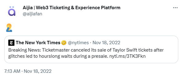 在各大媒体以 Breaking News(突发新闻)为题争相报道的时候,NFT 票务商 Aijia 转推新闻,配文:捂脸的小人。表达他们对 Web2 票务平台的无语。