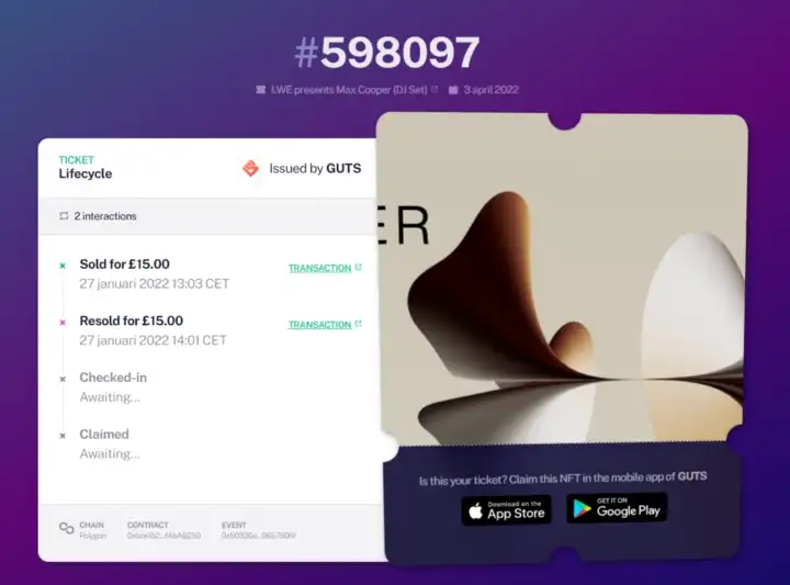 在 GUTS 的购票系统中,票价总是以法币定价的,但是在支付环节可以选择信用卡、PayPal、加密货币等各种方式。GUTS 尽其所能把加密货币和区块链的逻辑隐藏起来,不向普通用户呈现。实际上,他们颇费脑筋地设计了一套用于打通链上/链下的方案,兼顾了数据上链和大规模售票的性能问题,而且可以实现在**公链上。在 2020 年转向 NFT 方案之前,$GET **是悄悄在背后把链上、链下数据打通的**方式;而在 2021 年 DAO 化之后,$GET 还对应着投票权。