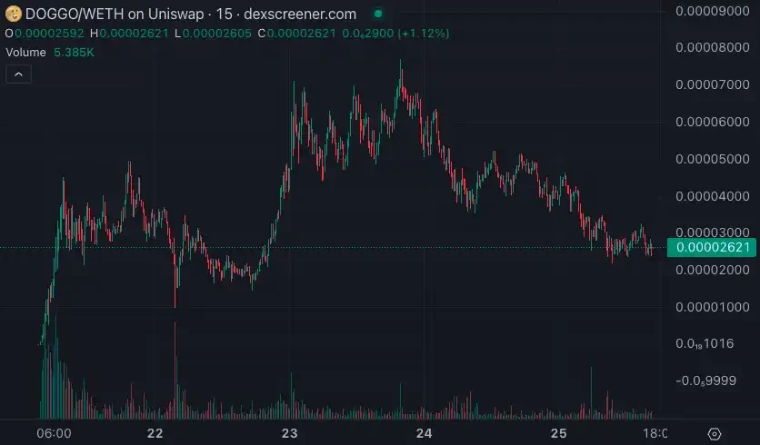 9 月 20 日,狗币创始人 Shibetoshi Nakamoto(@BillyM 2 k)在 X 上发了一段弱 智狗的视频并附言:what happened to poor doggo?随后便有团队发行了$DOGGO **,并将 6.56% 的 $DOGGO **打给 Shibetoshi,随后 Shibetoshi 便将手中的 $DOGGO **卖出。「创始人卖飞」的故事让$DOGGO 立刻火爆,但在次日 Shibetoshi 否认对 $DOGGO 的背书后,该 meme **便一蹶不振。