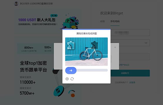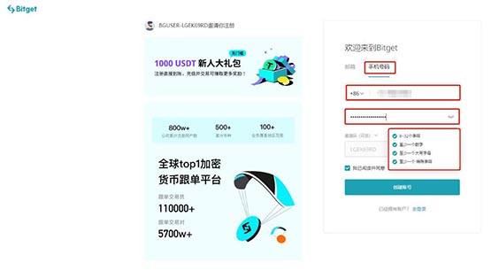 1、打开Bitget交易所,选择“手机号码”输入手机号,根据提示设置密码,点击“创建账号”