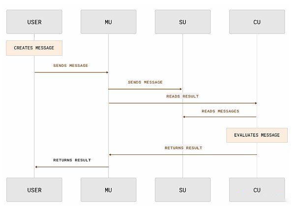 通信单元 (Messenger Units,MU):一种根据 cranking 的进程在AO网络中传递消息的节点,将消息传递给计算单元,并协调以计算输出结果。本质上,当 MU 在系统中发送消息时,它们将其发送到适当的SU进行处理,然后与CU协调以计算交互的输出,然后对**生成的发件箱消息递归地重复该过程。这个过程一直持续到没有更多的消息需要处理为止。