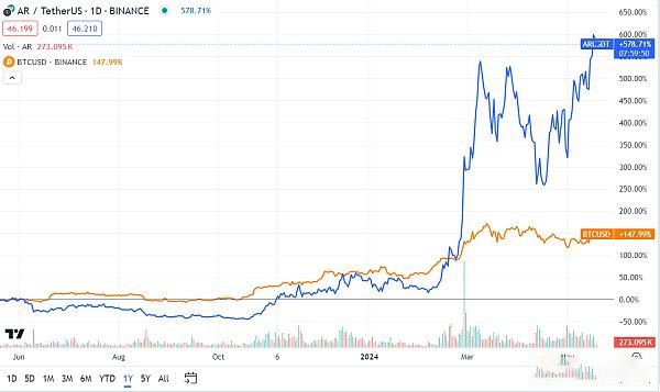 这样的困境同样反映在币价上,以一年期为分析周期,在2024年2月以前,AR的价格一直徘徊在6-10刀左右,大幅跑输BTC,没有随着主网升级和牛市的启动出现上涨,直到创始人Sam于2月14日公布Arweave正式推出AO。