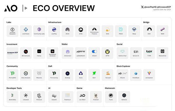AO测试网发布后的三个月内,AO网络中初步建立起基础设施和金融系统,包括跨链桥、预言机、钱包、AMM、稳定币协议等,同时游戏、社交、Memecoin、AI等应用也正在建立中。