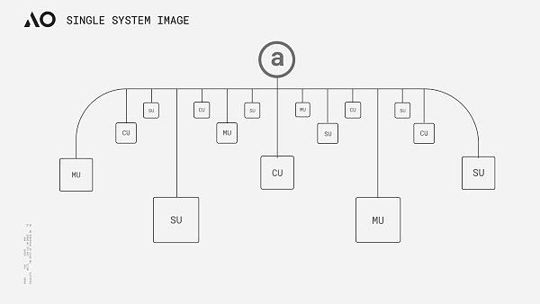 AO计算机是一个单一的、统一的计算环境( Single System Image,单系统映像,其是分布式计算的一种模式,使用一个多网络的通用接口,分布式数据库,或者多个服务器,但对用户而言是一个系统),托管在分布式网络中的一组异构节点上。AO旨在提供一个环境,其中可以驻留任意数量的并行进程,并通过开放的消息传递层进行协调。这种消息传递标准将机器的独立操作流程连接到一个“网络”中,就像网站在独立服务器上运行但通过超链接连接成一个凝聚的统一体验一样。
