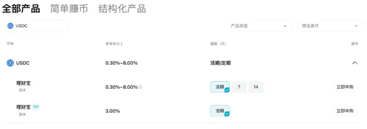 如果想要稳稳的幸福(10% 左右 apy),随取随用,直接选**化交易所理财;