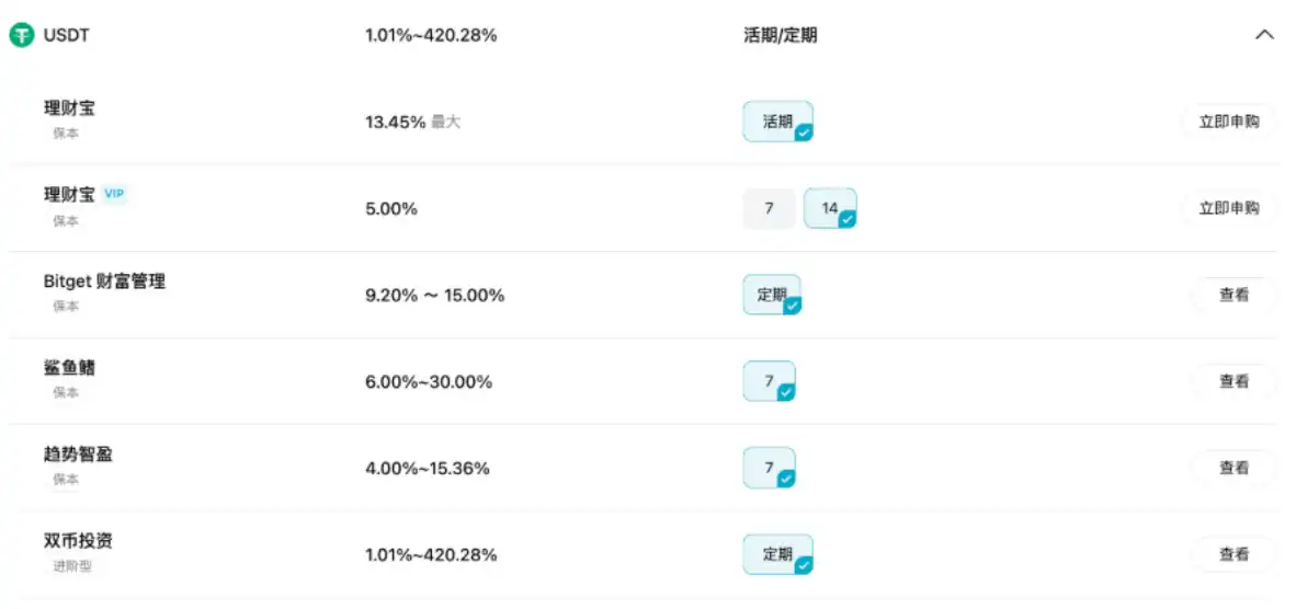 Bitget 提供多种理财产品,灵活的“理财宝”活期/短期理财、稳健的“财富管理”定期/长期产品(年化收益 9.2%-15%,当前约 13%)以及高收益的“双币理财”。可以根据风险承受能力和资金需求,选择合适的产品。