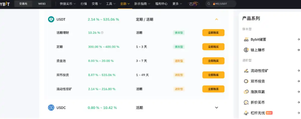 Bybit 的理财产品也非常丰富,提供包括 USDT 和 USDC 在内的多个稳定币产品,包括保本型和进阶型。其中,保本型的活期利率也有 10%。