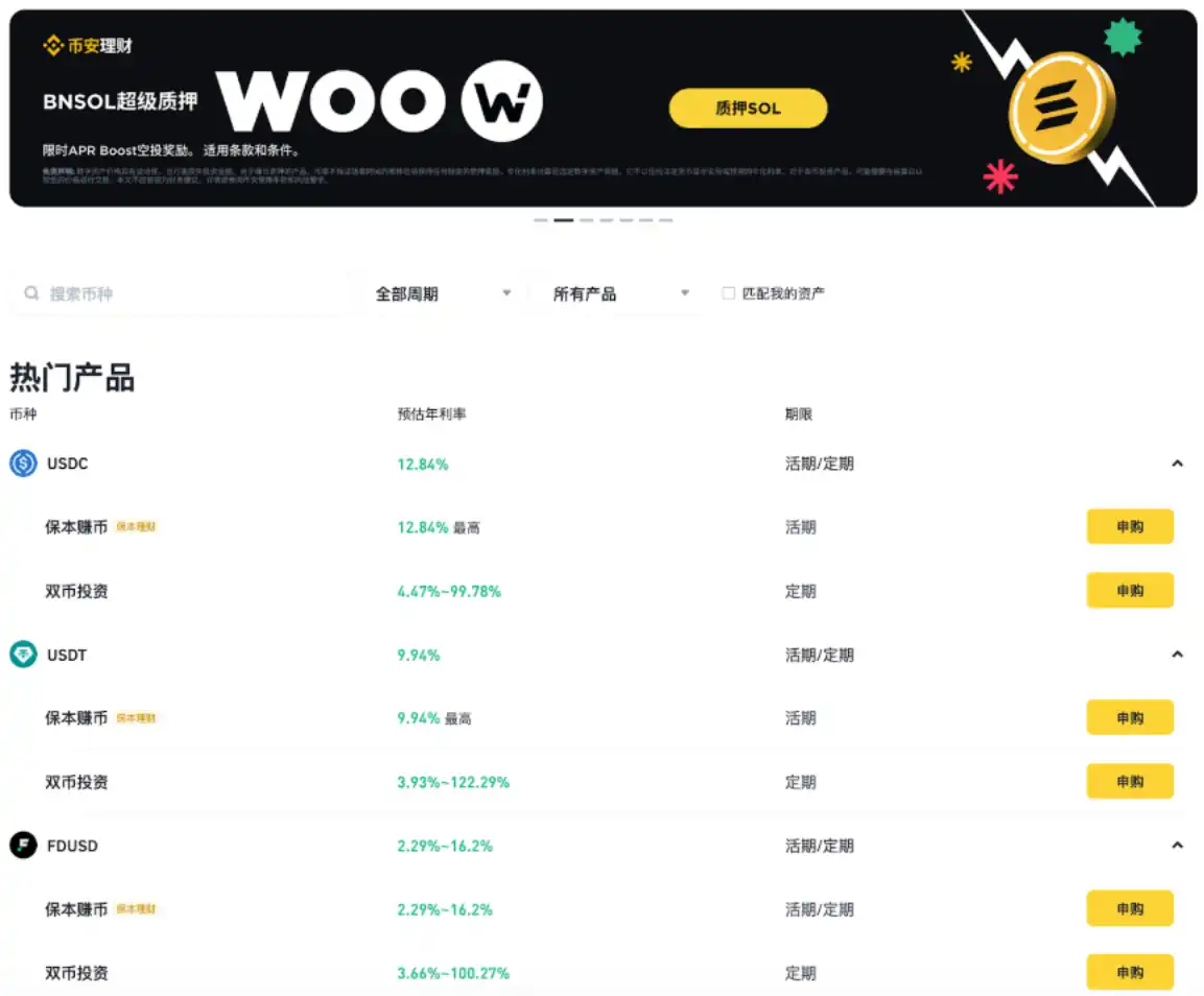 Binance USDT 和 USDC 的定期或活期理财产品,适合不同需求的用户。年化收益率稳定在 10% 左右,部分高收益期可以达到 16%。
