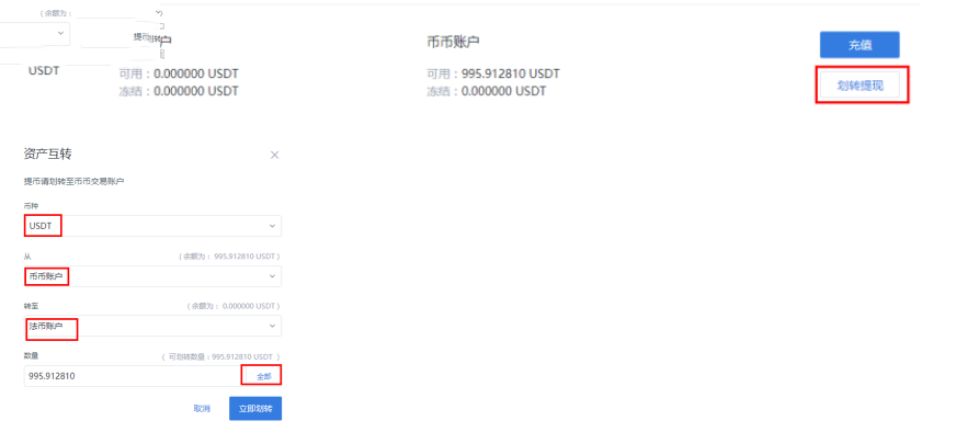 1.资金划转。在出售USDT兑换**民币之前,你需要将币币资产里的USDT转到法币账户下(需要先登录账号才能看见),如下图:
