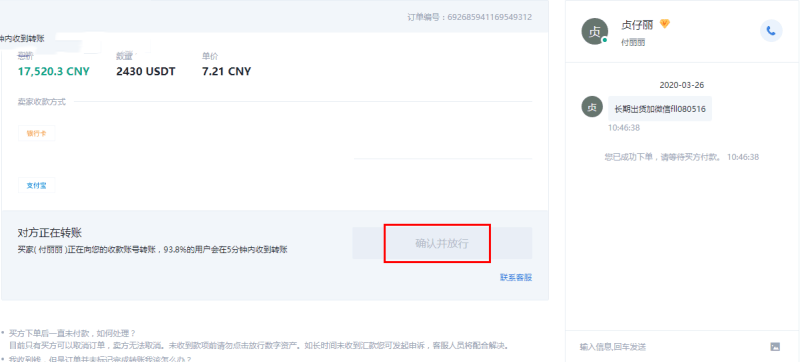5.等待转账。点击下单,在弹出的页面,等待买家付款,此时,确认并放行 按钮是灰色不可以点击的。您也可以在右侧对话框与买家交流(其实**没必要哈)。