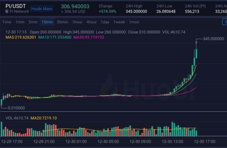火必交易所(Huobi)上架Pi 币交易对后当日,Pi 币价格一路攀升数倍,并在当日 17 时许飙升至345 美元,日内涨幅达到476%。