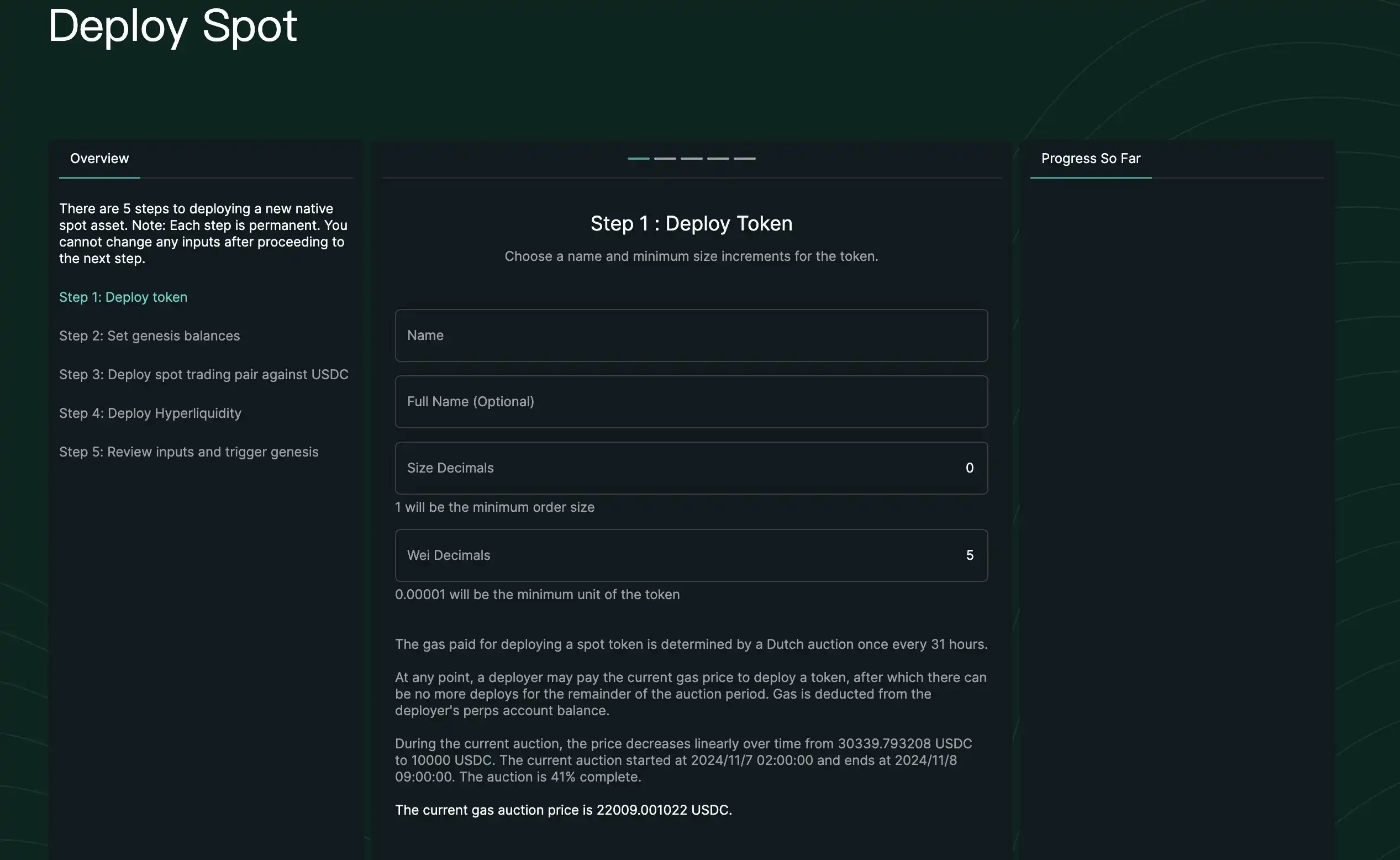 而 Hyperliquid 的上币流程为持续 31 小时的荷兰拍,在此期间,**部署费用会从初始价格线性下降至 10000 美元稳定币(USDC),直至有**拍下即上线 Hyperliquid 现货市场。如果**一次拍卖失败,初始价格将恢复到 10000 美元稳定币,否则拍卖的起始价格将是上一次价格的两倍。