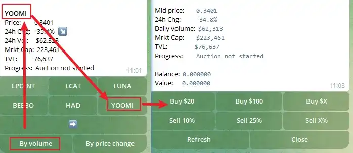 另一种方式为通过 Telegram 主页的「/launches」(可选交易量或价格排序)或者「/chat」两个方式进行购买,前者为官方数据筛选工具,点击后直接选择购买数量。后者为公开聊天频道,能够在其中发现热门**,同样通过点击跳转的方式进行交易。