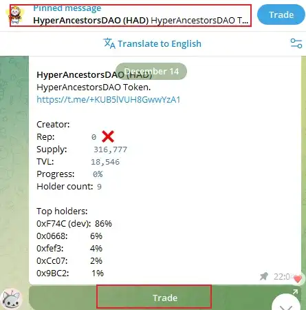 购买**比较奇特,最普适的方式是从网页版跳转**频道,然后在通过置顶消息能够跳转至 Trade 界面(作者暂未发现直接从 Telegram 搜索**的方式)。