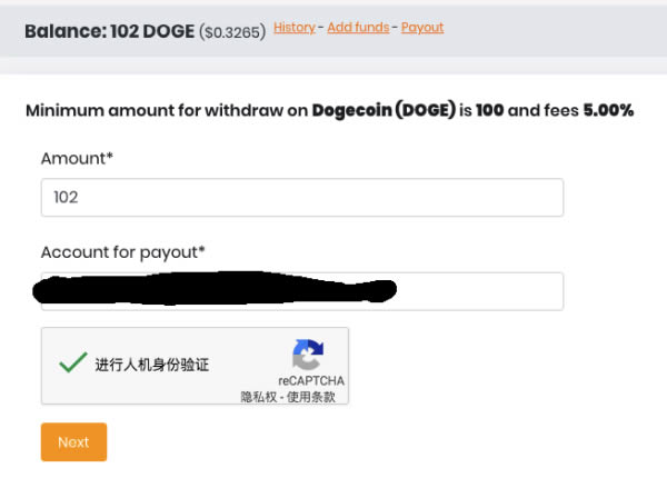 点击BALANCE下方的Payout,输入自己的狗狗币地址进行提币。**提币数额为100个,手续费为5%。由于目前我挖出的币还不足100个,所以会在后续更新这一部分。
