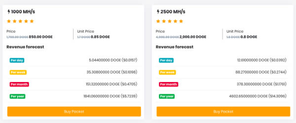 2:也可以直接购买算力包。共有8个算力包,下面举例两个。直接购买算力包更划算一些。比如下面1000MH/s的算礼包需要850个狗狗币,换成法币大概在2美元多一些。预估1年后可以获得1841个狗狗币。买得越多,越划算。