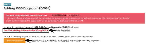 2:进入下面的充值页面。充值和确认需要在1个小时内完成,向下面红色标注的狗狗币地址支付狗狗币。确保支付数量和上面填写金额的一致。交易在经过至少3次确认后点击Check My Payment(大约是在充值后10分钟,如果提示没有到账,可以稍微等一下再次点击确认)。