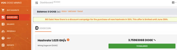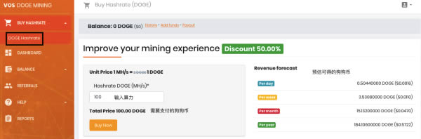 1:点击BUY HASHRATE下方的DOGE Hashrate。可以直接输入算力购买。