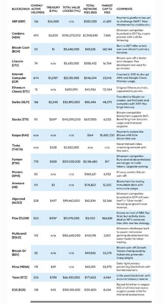 4月27日消息,福布斯(Forbes)发文列举了目前加密领域内20 大市值超过10亿美元的僵尸**,其中包括:XRP、ADA、BCH、LTC、ICP、ETC、XLM、STX、KAS、THETA、FTM、XMR、AR、ALGO、FLOW、EGLD、BSV、MINA、XTZ、EOS。