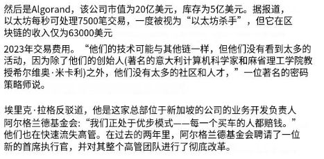 “Algorand,市值为20亿美元,国库为5亿美元。它曾被视为“以太坊杀手”,因为它每秒能够处理 7500 笔交易,但在 2023 年,它只带来了 63000 美元的区块链交易费用。
