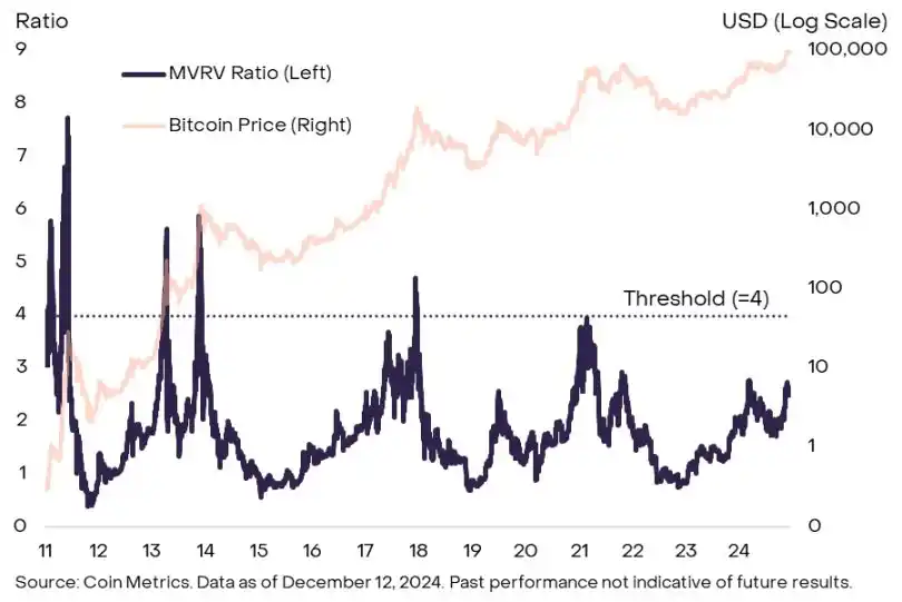 自 2009 年比特币诞生以来,加密货币市场已经取得了长足的进步,当前加密牛市的许多特点与过去不同。最重要的是,美国市场对现货比特币和以太坊 ETF 的批准带来了 367 亿美元的净资本流入,并帮助将加密资产纳入更广阔的传统投资组合。此外,我们认为,最近的美国大选可能会给市场带来更多的监管清晰度,并有助于确保加密资产在全球**经济体中的**地位。与过去相比,这是一个重大变化,此前观察人士一再质疑加密资产类别的长期前景。出于这些原因,比特币和其他加密资产的估值可能不会遵循早期的历史规律。