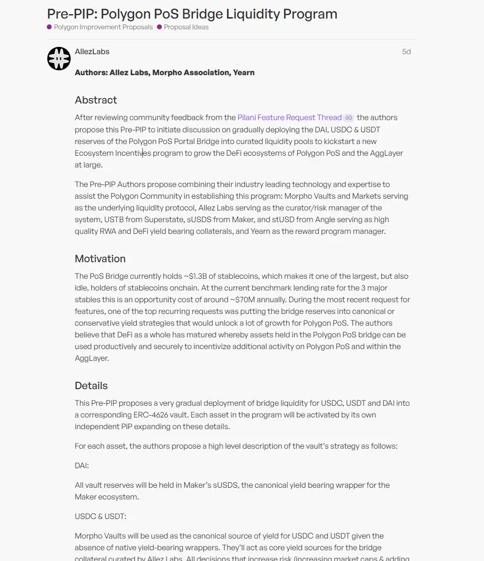 据了解,Polygon PoS 桥接中持有约 13 亿美元的稳定币储备,社区建议将这些闲置资金部署到经过精心挑选的流动性池中,以产生收益并促进 Polygon 生态系统的发展。根据当前的**利率,这些资金每年可能带来约 7000 万美元的收益。