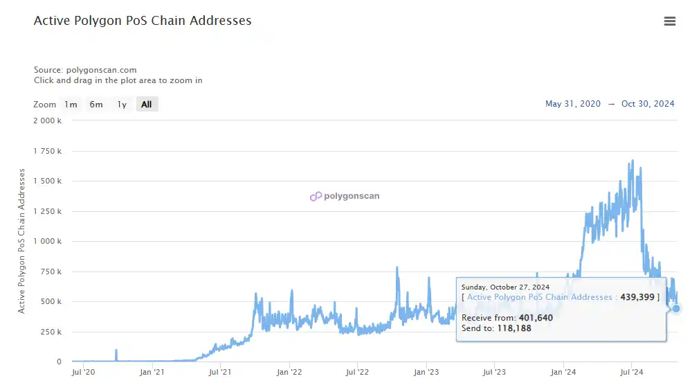 生态发展**,Polygon 在技术和产品方面并未放弃,在近一年内多次发布技术创新和产品布局的声音。表现最亮眼的自然是预测市场 Polymarket 在近一年的发展。此外,10 月,Polygon 发布了新的统一区块链生态系统 AggLayer,据官方的介绍称,Agglayer =统一链(L1、L2、L∞),但显然这个新生态系统的定位似乎不太好理解,11 月份官方还曾专门发表一篇文章对 AggLayer 解释。