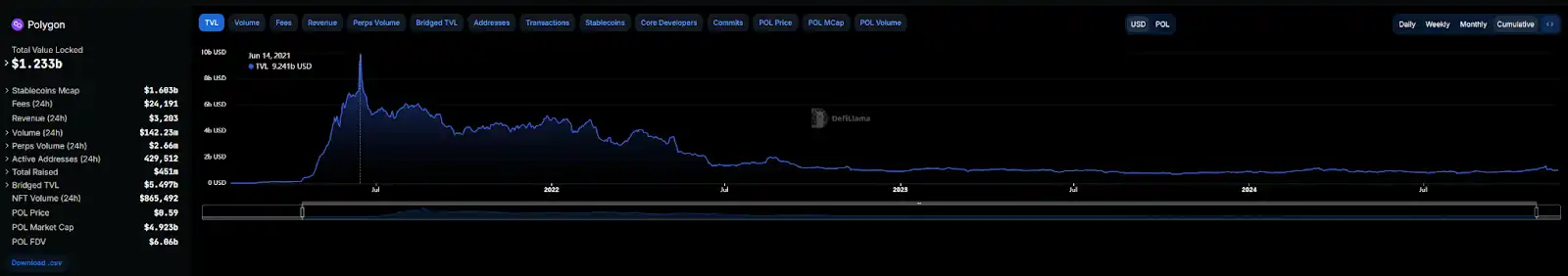 Polygon 生态最繁荣的时候是 2021 年 6 月,当时的 TVL 总量达到 92.4 亿美元,是今天的 7.5 倍。而随着时间流逝,Polygon 的 TVL 曲线则一路下滑,从 2022 年 6 月就开始维持在 13 亿美元左右,再无太大的起伏。到 2023 年,还曾一度跌至 6 亿美元左右。2024 年,市场回暖,Polygon 的 TVL 量多数情况下也还是在 10 亿美元以下,从 10 月份开始才勉强回升至 10 亿美元以上。