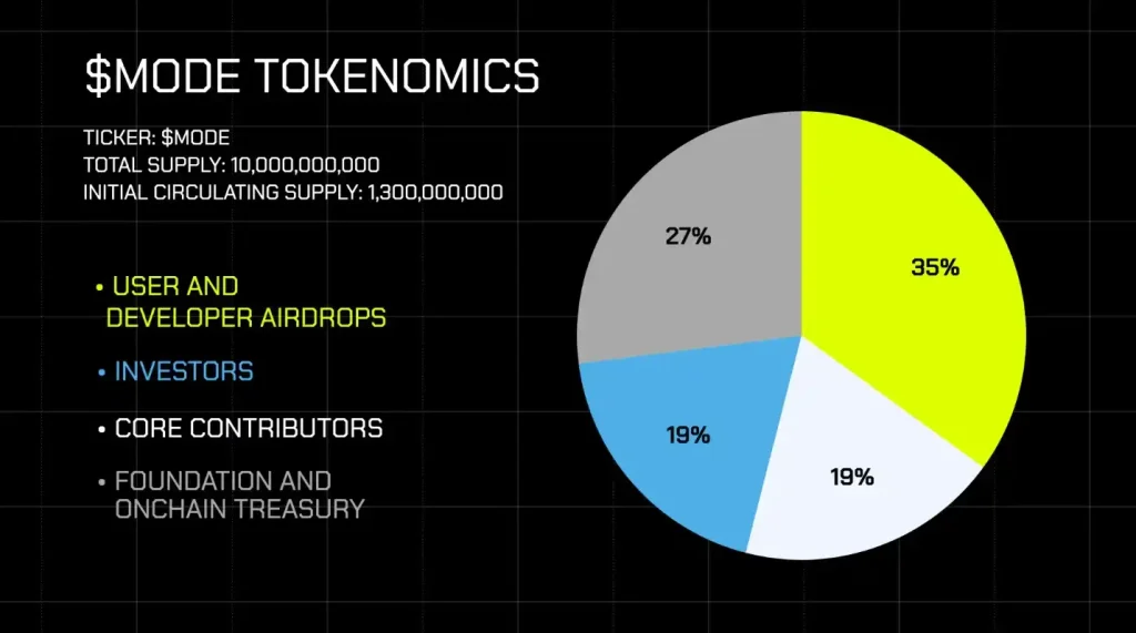 此外,MODE 的总供应量为100 亿枚,其中初始流通供应量将为13 亿枚,流通市占率部分来自**季空投奖励,部分来自基金会和链上财库。