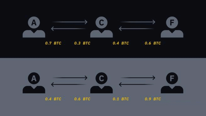 Carol充当Frank的中间连接没有损失价值,但是自己的资金支配灵活性变差。可以看到,她目前在与Alice的通道中可花销0.6 BTC,但在与Frank的通道端只能支配0.1 BTC。