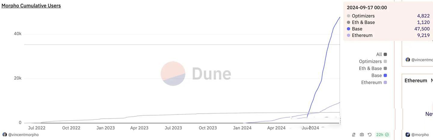 在今年上线 Base 网络后,Morpho 在 Base 网络的累计地址量已经超过 4.5 万。相较于更早版本的地址数,如今的 Morpho 有了数量级上的提升。
