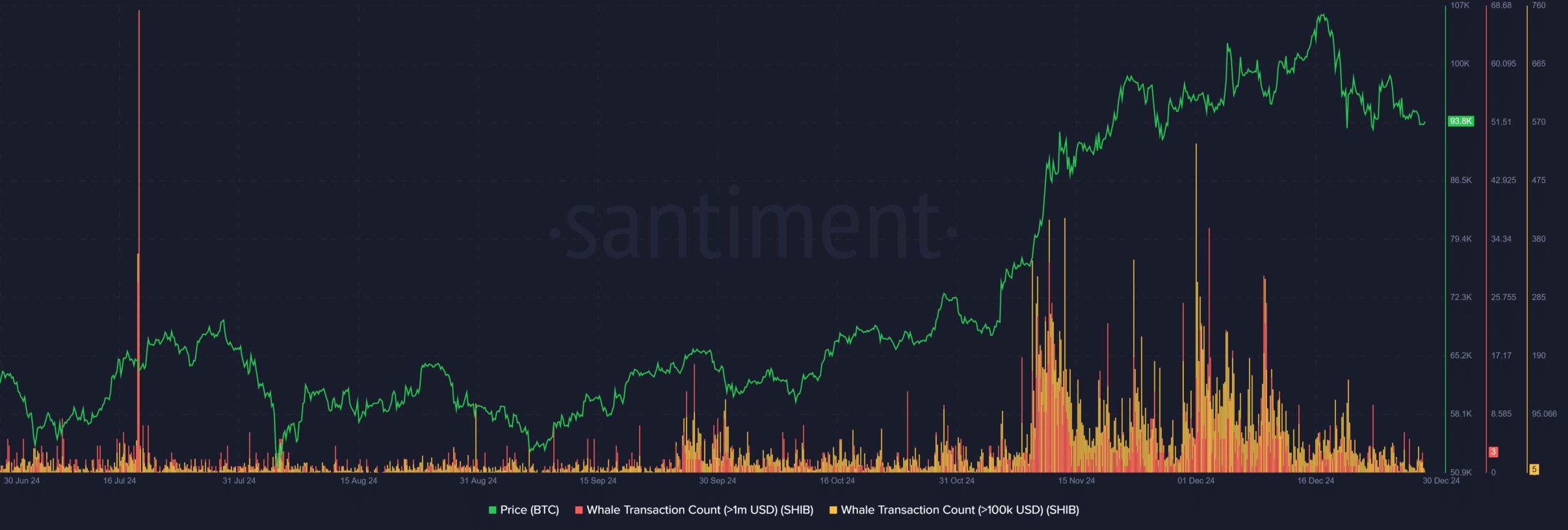 AMBCrypto 对 Santiment 数据的分析显示,在 2024 年 <> 月和 <> 月的关键价格上涨期间,鲸鱼活动明显激增。这表明大宗交易与 SHIB 的势头之间存在直接关联。