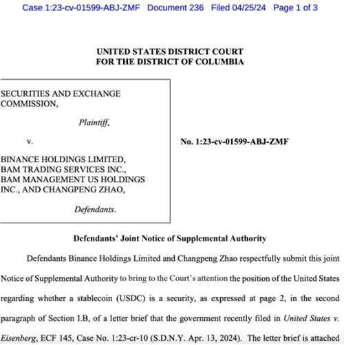 在全球加密货币领域颇具影响力的交易所币安及其前**执行官赵长鹏(CZ),4月27日针对与美国证券交易委员会(SEC)之间的法律诉讼,向法院递交了一份重要文件。该文件意在明确美国政府对稳定币USDC是否应被视为证券的官方态度。