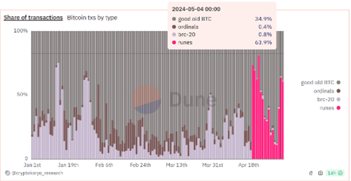 根据 Dune Analytics 提供的数据,截至4月24日,与 Runes 相关的交易占据了比特币网络交易的大部分份额。