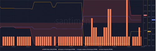 与此同时,我们对Santiment数据进行了分析,结果显示PORK的MVRV比率在5月5日出现了下降,这表明获利的投资者正在减少。随着价格转为看跌,投资者纷纷选择抛售,这从PORK的活跃存款增加可以看出。此外,5月5日交易所供应量上升,而交易所外供应量下降,进一步证明了当前抛售压力的巨大。